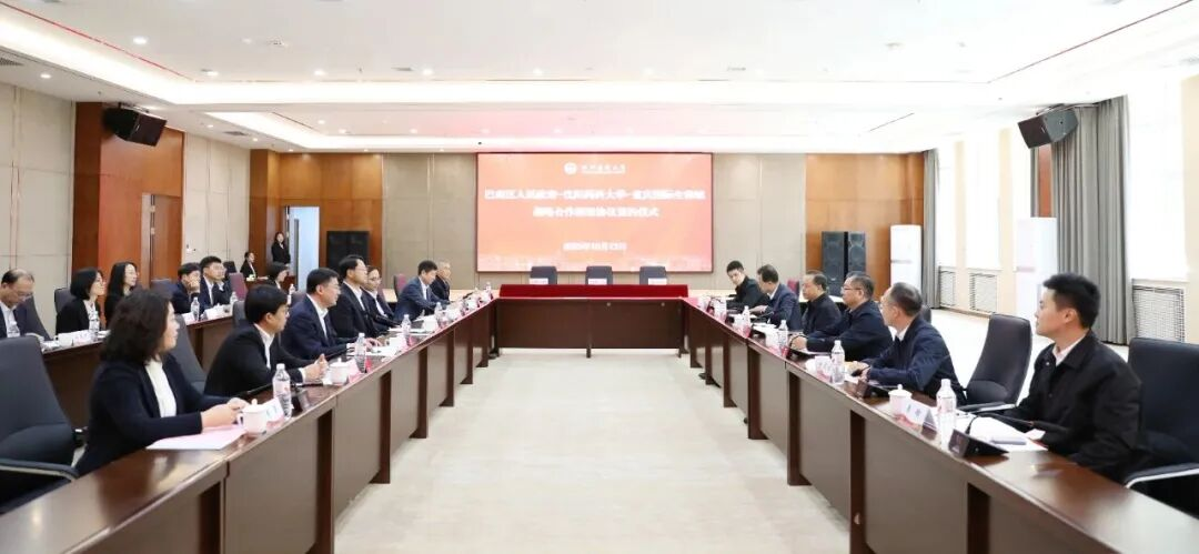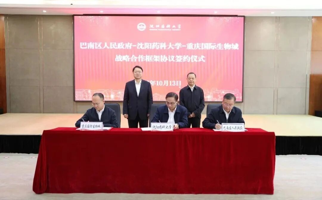 10月13日,沈阳药科大学与重庆市巴南区人民政府、重庆国际生物城开发投资有限公司战略合作框架协议签约仪式在南校区国际交流中心报告厅成功举行。重庆市巴南区区委副书记、区人民政府区长钟涛,副区长杨昆,重庆国际生物城开发投资有限公司党委书记、董事长李锐,我校党委书记高明宇,校党委副书记、牵头负责学校行政工作的副校长齐炼文,学校领导班子成员关雪峰、李可强、宋少江、卢文春、翟鑫出席签约仪式。仪式由关雪峰主持。座谈交流